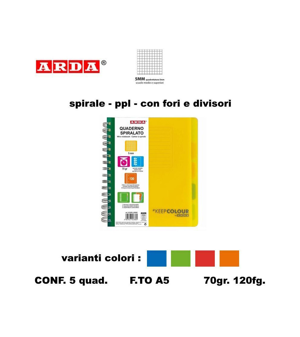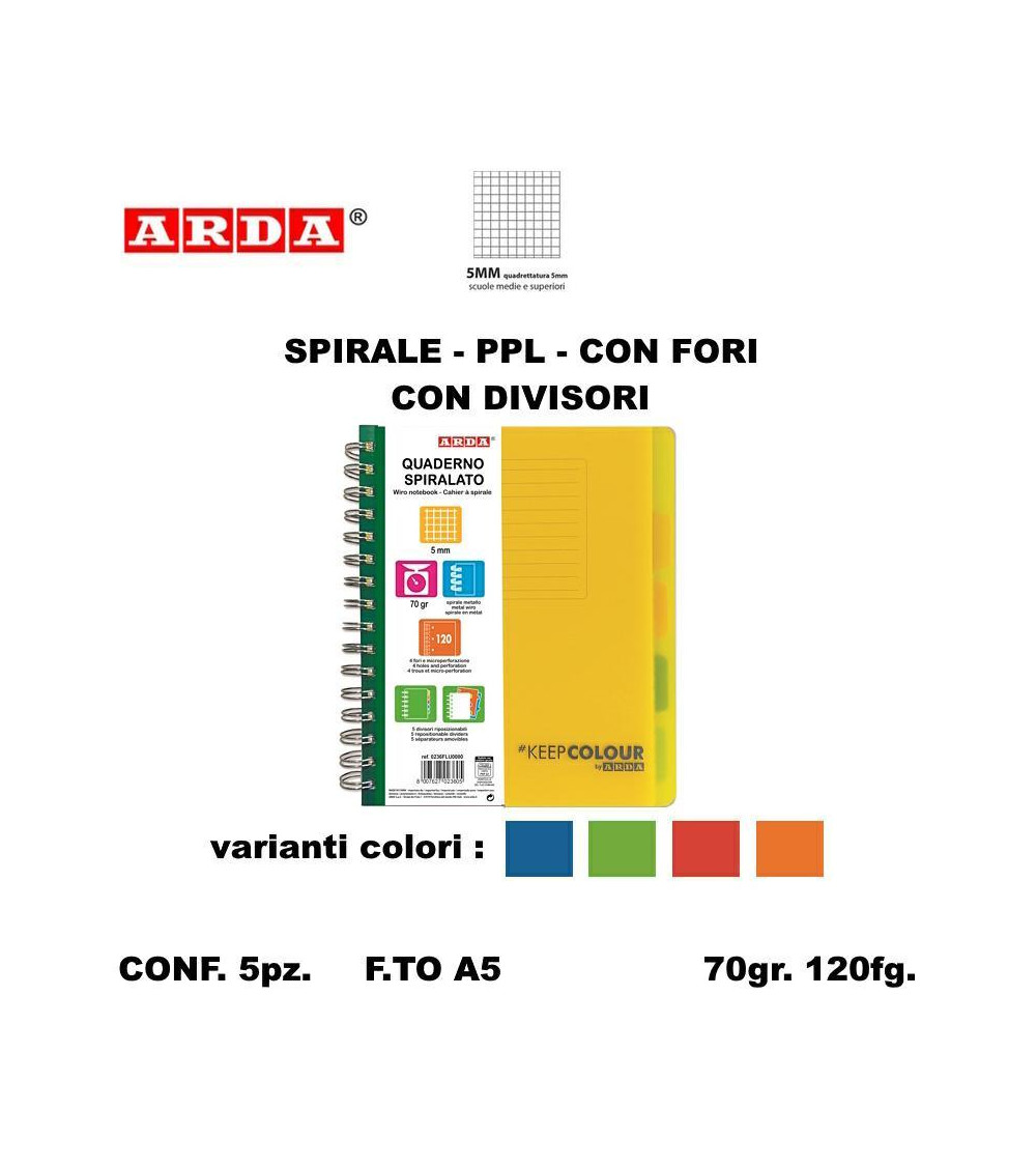 ARDA QUADERNO SPIRALE PPL FORI + DIVISORI 120fg. 5MM [5PZ]
